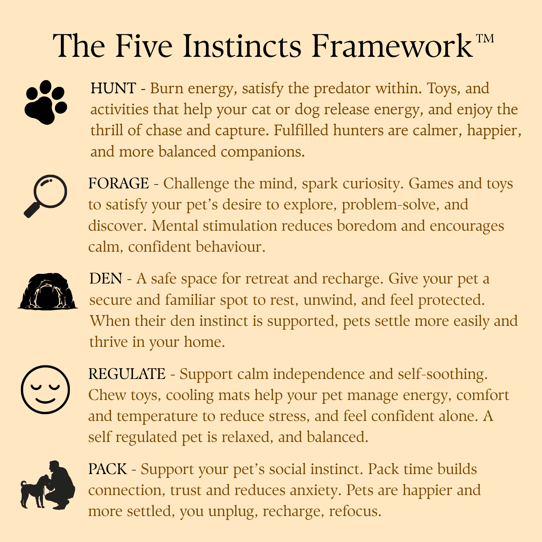 By supporting your pet’s natural instincts, HUNT, FORAGE, DEN, REGULATE, and PACK (The Five Instincts Framework™), you create an environment that has been proven to leave them calm, confident, and ready to engage (The Instinct Advantage™), while you focus on what matters.